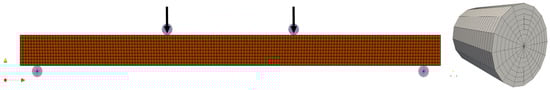 A three-dimensional finite element model (3D-FEM) was developed into the open source finite element code Salome Meca® (Version 2019, Code Aster, France) [29] to evaluate the behavior of the manufactured glulam timber subjected to four-point bending test. The samples were modeled as elasto-plastic solids and nonlinear analyses were performed using a linear elasto-plastic constitutive model with hardening. The constitutive model received as input parameters the elastic modulus, shear modulus and Poisson ratio for the linear elastic part, and the yield stresses for the plastic part with hardening. The 3D-FEM model consists of one piece with a rectangular cross-section and four simply supported solid rollers (see Figure 7). Bottom rollers represent the supports and top ones the points of application of the loads in the testing machine. In order to get accurate results with reasonable computational cost, an analysis of convergence of results dependent of element size was carried out. An optimum size of 8 mm was achieved and the sample was meshed into 9240 eight-node brick elements having a total number of 11,935 nodes. Each roller was meshed into 1648 six-node wedge elements with a total number of 1109 of nodes, allowing a proper adaptation to the cylindrical shape. The right subfigure in Figure 7 shows the defined mesh for the supports and load cells in detail. The average radial size for each element was 2.75 mm and an outermost size of 5.85 mm was adopted, resulting in a total roller diameter of 30 mm. Due to the set-up of the experimental part, four-point bending test, the material definition of the 3D-FEM model was considered to be isotropic. In this case, the specimen is working mainly in the longitudinal direction without any transverse constraints and the mechanical properties in the longitudinal direction are the most relevant for this analysis. The isotropic model also implies an intermediate-low computational cost without important influence in the results. Rollers for the experimental test were made of steel so, in consequence, the elastic modulus of 210 GPa and the Poisson’s ratio of 0.3 were considered.