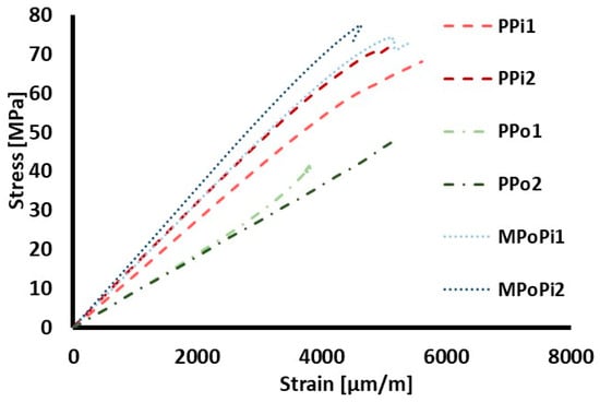 Finally, Table 7 depicts the stiffness obtained from the numerical simulations and experimental data from Figure 10. As mentioned above, the elastic range is very similar for both phases, supported by a low value of error between numerical and experimental stiffness, which is below 4%. It is clear that the single-species poplar samples show the lowest stiffness as confirmed by the results, while the mixed pine poplar sample MPoPi2 show the highest one, due to the existence of the T30 plank’s strength class at the outer layers. The single-species pine samples show a relatively small reduction in stiffness compared with the MPoPi-2 specimen, which demonstrates that the extreme fibers have the highest contribution to the general strength of the sample. In particular, by comparing PPi2 and MPoPi1 samples, which are composed by the same strength class of outer planks, T24, it is clear that the insertion of poplar planks at the inner part produces a very small reduction in stiffness. Similarly, the results from Table 7 also show that the shear modulus does not play an important role in the computation of stiffness (K), keeping a variation below 3.5% with and without using G.