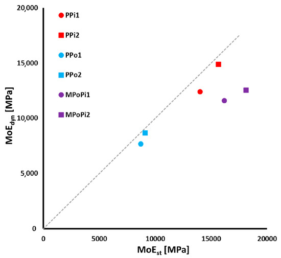 Comparison between modulus of elasticity for the tested samples. MoEdyn,gt: dynamic modulus of elasticity. MoEst: static modulus of elasticity. Gray dotted line: y = x.