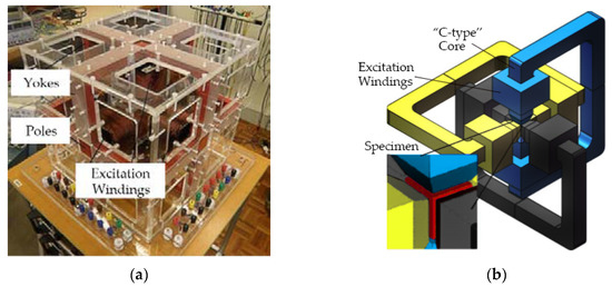- Zhu, J.; Ramsden, V.S. Two dimensional measurement of magnetic field and core loss using a square specimen tester. IEEE Trans. Magn. 1993, 29, 2995–2997. [Google Scholar] [CrossRef]