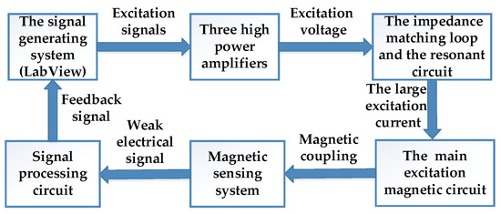 Figure 2 is the structure diagram of the measuring system. The signal generating system was used as the computing core to provide the analog excitation signals for three high power amplifiers. Then the excitation voltage signals were selected by the impedance matching loop and the resonant circuit to obtain a large excitation current, which acted as the input of the main excitation magnetic circuit so as to generate a rotational magnetic field inside the measured specimen. The sensing coils on the specimen can pick up weak electrical signals, and then these signals are input into the signal processing circuit and collected by a LabView embedded control system. The closed-loop feedback of the system is realized in such way.