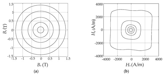 The classical vector Preisach hysteresis model given above implies that for a uniformly and rotationally applied B, the locus of H is circular [20], as shown in Figure 3a. However, the locus of H exhibits a bit petal-like shape because of the slight magnetic anisotropy property of the SMC material itself, as shown in Figure 3b. It is obvious that the classical vector model is no longer applicable. In order to circumvent the limitations of the classical model above, an improved Preisach model was proposed by introducing two parameters w and z. These two parameters are connected to the amplitude of Everett function E and the projection of magnetic flux density along different directions.