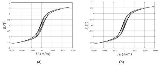 The measured concentric hysteresis loops along two orthogonal directions, i.e., x direction and y direction, are shown in Figure 4. The hysteresis curves at the saturated magnetic flux density are the limiting hysteresis loops required for identification of the Preisach model.