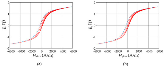 The function F in Equation (14) can be constructed numerically based on the measured limiting hysteresis loops in Figure 4. Their descending branches are used for the generation of the FORCs by the numerical method proposed by Dlala [22], as shown in Figure 5.