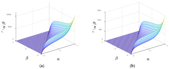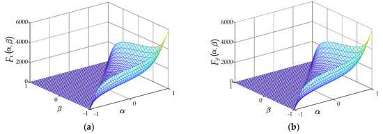 According to Equation (15), the corresponding scalar Everett functions Fx and Fy are depicted in Figure 6, respectively.