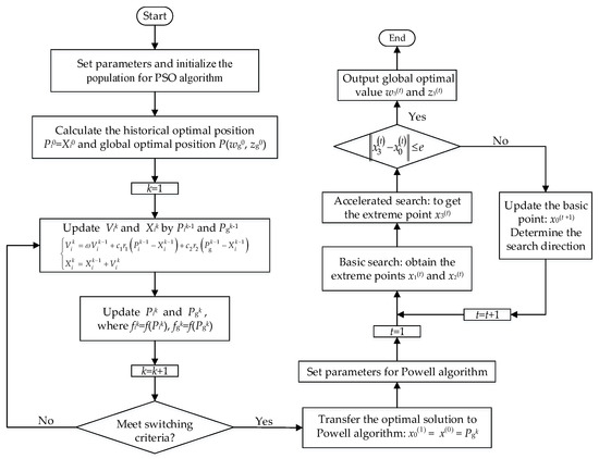 - Determine whether the switching criteria as Inequation (21) is satisfied. If satisfied, the current optimal solution Pgk= P(wgk, zgk), and the corresponding objective function fgk, are transferred to the Powell algorithm and the calculation process is ended. Otherwise, set k = k + 1 and repeat from step (3).where = 0.01. n0 is the number of consecutive iterations, and was set to 10 in this paper.