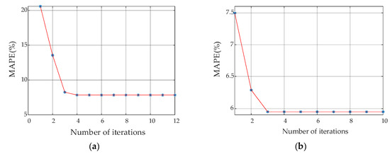 In contrast to the convergence performance of the PSO algorithm in Figure 10, Figure 12 as below shows the corresponding variation of MAPE with the iteration steps based on the PSO-Powell hybrid algorithm.