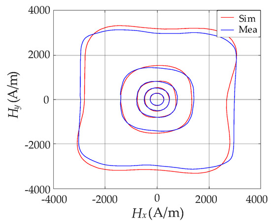 Based on the extracted parameters in Table 2, the comparison between the measured hysteresis curves of vector H and simulated results optimized by the hybrid algorithm was made and is depicted in Figure 13. The simulated results strongly agree with the measured ones when Bm varies within a wide range, which can reflect the slight anisotropy hysteresis properties of the specimen. The effectiveness and accuracy of the improved vector model connected with the hybrid algorithm of PSO–Powell were verified.