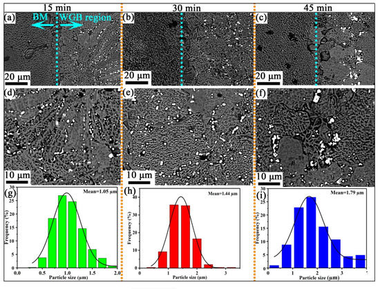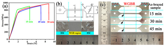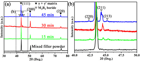 - At the brazing times of 15 min, the M3B2 boride particles were mainly distributed at the dendrite boundary, and their size was fine. The M3B2 boride particles in the joint brazed for 30 min exhibited the most uniform size and semi-coherently precipitated in the matrix, with an approximate spherical size of about ~1.44 μm. When the brazing time was further increased to 45 min, the grains and particles coarsened. Therefore, 30 min was determined to be the optimal brazing time to obtain high performance.