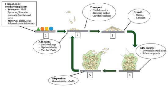 Biofouling is a sequential, four-step phenomenon governed by several physical, chemical, and biological factors: attachment, proliferation, maturation, and dispersion, as depicted in Figure 1 [7,18,19]. However, the literature does not focus on the formation of biofilm within bioreactors. Since biofouling affects many industries, biofouling occurs on many different surfaces. Therefore, prior to the adhesion of microorganisms to the surface, the properties of the surface that influence biofouling are added to the system.