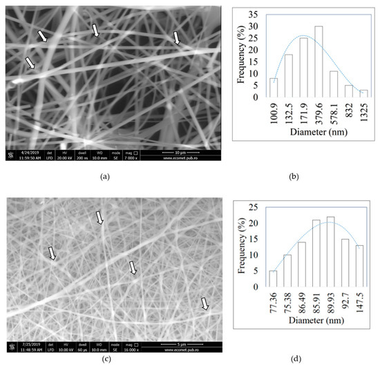 The morphology and diameter of type of each electrospun protein-based nanofiber were observed by scanning electron microscopy coupled with energy-dispersive X-ray spectroscopy (SEM-EDS), using a Quanta 450 FEG scanning electron microscope (FEI, Eindhoven, The Netherlands) equipped with a field emission gun at a 1.2 nm resolution. The specimens were gold-sputtered prior to imaging, in order to increase their electrical conductivity. The diameters of minimum 50 nanofibers were measured and the results were processed using Origin 2016 software (OriginLab, Hampton, MA, USA).