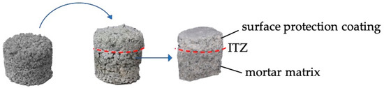 Schematic representation of a mortar before and after the application of the surface protection cementitious coatings.
