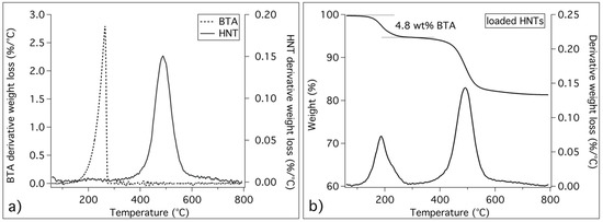 First, HNTs and BTA were separately characterized by means of thermogravimetric analysis. Figure 2a shows that BTA decomposition starts at about 200 °C, while HNTs show a main signal centred at about 490 °C. To set the optimal conditions to entrap BTA into HNTs, we used a very concentrated BTA solution, and we monitored the pressure during the air/vacuum cycles, as explained in Section 2.2. The thermogravimetry/derivative thermogravimetry curves (TG/DTG curves) of the loaded nanotubes are shown in Figure 2b, where it is evident that BTA was successfully entrapped into HNTs. The intense signal at ≈200 °C in Figure 2b confirms that the loaded HNTs contain about 5 wt% of BTA.