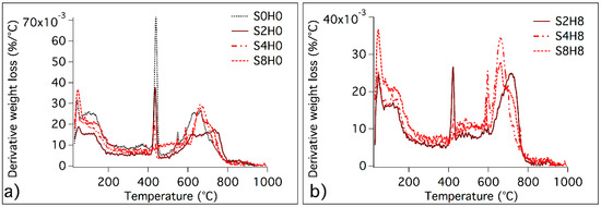 The curves in Figure 3a,b allow us to discriminate the effect of silica from HNTs. The signal at about 430 °C is ascribed to portlandite (Ca(OH)2) and its intensity decreases with the increase in SiO2, due to the pozzolanic reaction that consumes portlandite in the reaction with the silica [49]. The binder gel phase calcium silicate hydrate (C–S–H), the main product of the hydration reaction, decomposes, together with aluminate phases, between room temperature and 200 °C [49,50,51], and this peak is particularly intense when SiO2 is present. HNTs are responsible for the peak at about 490 °C (see Figure 2b), while sand and carbonated phases are associated to the large peak between 500 and 800 °C. From the comparison between Figure 3a,b we can conclude that the presence of HNTs does not involve significant differences.