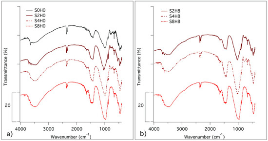 FTIR spectra of (a) S0H0, S2H0, S4H0 and S8H0; (b) S2H8, S4H8, S8H8. Samples have been lyophilized and analysed after 28 days of hydration. Spectra have been offset for the sake of clarity.