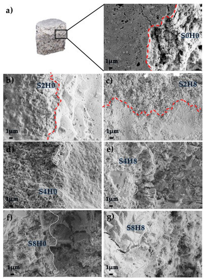 SEM images of top coating/bottom matrix interphases: (a) sketch of the interphase and morphology of the ITZ bottom matrix/S0H0 coating; (b) ITZ bottom matrix/S2H0 coating; (c) ITZ bottom matrix/S2H8 coating; (d) ITZ bottom matrix/S4H0 coating; (e) ITZ bottom matrix/S4H8 coating; (f) ITZ bottom matrix/S8H0 coating; (g) ITZ bottom matrix/S8H8 coating.
