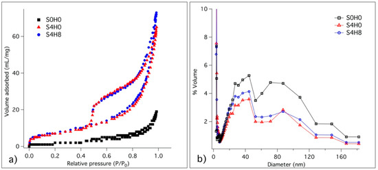 Following the results of the previous sections, we decided to focus our attention on samples containing 4 wt% of silica, S4H0 and S4H8. The sample S0H0 was also studied for comparison. Through porosimetry, the surface area and pore size distribution of the more promising samples were measured. Figure 6 shows the adsorption/desorption isotherms (a), and the pore volume percentage distribution (b) for the investigated pastes, while Table 2 summarizes the BET surface area and total pore volume calculated from the plots.