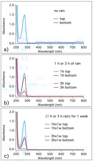 UV-vis spectra of the top and bottom piece solutions for surface coated surfaces under different conditions of rain: (a) no rain; (b) 1 h and 3 h of moderate rain; (c) 1 h and 3 h of moderate rain repeated for 1 week.
