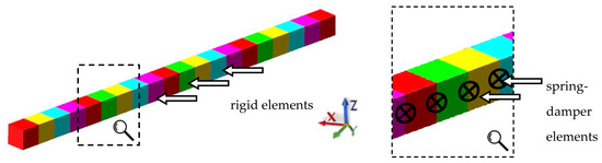 The beam model using the predefined rigid finite elements was built in MSC Adams 2019 (MSC Software, Newport Beach, California, USA) [41]. The division of the beam under consideration into rigid finite elements and spring-damping elements is shown in Figure 5. The model consisted of 20 rigid finite elements of equal length and 19 spring-damping elements (modeled in MSC Adams environment using 6 × 6 field elements). The model had 120 degrees of freedom.