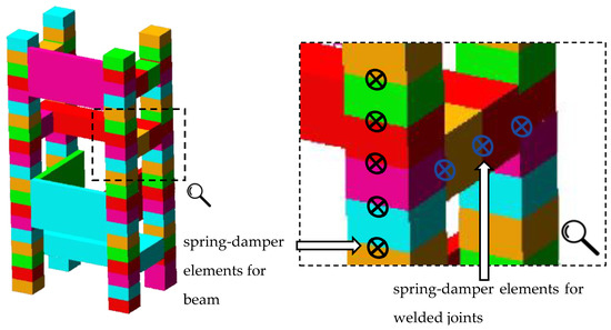 In previous research [32], it was proved analytically and experimentally confirmed that it is possible to build a reliable model of a composite steel-polymer concrete beam using an equivalent bending stiffness and an equivalent mass per unit length. Adopting the Hamiltonian developed in [32] and the model assumptions that the contact of the steel profile with the polymer concrete filling occurs on the entire inner surface of the steel profile and the adhesion forces prevent tangential movements within the material contact area, the steel-composite beam was modeled using rigid finite elements characterized by mass and moments of inertia, which were connected to one another using spring-damping elements [37,38].