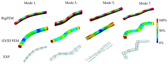 The results for the RigFEM and FEM models of the beam were compared to the experimental results. Table 5 compares the values of natural frequencies supplemented by the value of relative error defined as follows Equation (11):