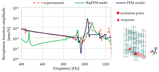 Analyzing the comparison presented in Figure 10, it can be seen that the RigFEM model gives less accurate results compared with FEM model, in particular in the lower frequency range. For the RigFEM model, the amplitude mapping of the first resonance is inaccurate; a similar phenomenon can be seen for resonances close to the frequency of 1200 Hz.