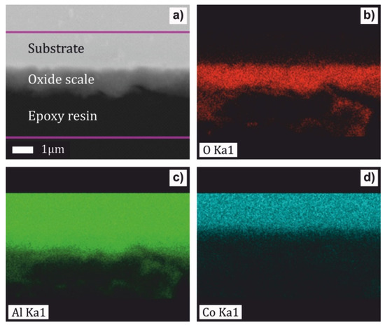 The oxidation behavior of the as-solidified Al76Co24 and Al71Co29 alloys was studied in flowing synthetic air at 773, 973 and 1173 K. The microstructure and chemical composition of the oxide scale were investigated by SEM/EDS. The cross-section of the Al71Co29 alloy after oxidation at 1173 K is presented in Figure 4. The oxide scale was homogeneous. EDS element maps are included in Figure 4b–d. The scale was found to be composed of aluminum oxide.