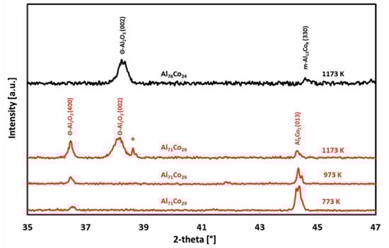 The phase constitution of the oxide scale was studied by room temperature X-ray diffraction. The diffraction patterns of the Al71Co29 alloy are presented in Figure 6. In the alloy, peaks corresponding to θ-Al2O3 have been identified. θ-Al2O3 is a metastable alumina phase [64,65]. θ-Al2O3 structures are based on a cubic close packing of oxygen anions. The cubic close packing of oxygen anions of θ-Al2O3 is deformed monoclinic. The thermodynamically stable α-Al2O3 adopts a corundum structure. θ-Al2O3 is a transition phase. It transforms into stable forms of alumina during long term annealing [65]. Metastable θ-Al2O3 has been found in oxidized Al-Cu-Fe alloys studied previously [66]. It was formed initially with an orientational relationship to the substrate. At 1173 K, θ-Al2O3 was found to slowly transform into α-Al2O3 with an increasing oxidation time (70 h, [66]).