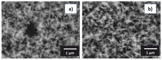 At 1173 K, an orientation of θ-Al2O3 in (002) crystallographic plane has been found (Figure 6). The same behavior was also observed for the Al76Co24 alloy (Figure 6). This observation indicates a preferential crystal growth. The morphology of alumina scale formed on the Al71Co29 and Al76Co24 alloys after oxidation at 1173 K for 30 h is given in Figure 7. The scale had a blade-like structure. The platelet-like scale morphology is indicative of rapid outwards growth. Alumina scales grow by counter-diffusion of aluminum and oxygen [67]. The ions, however, diffuse faster in polycrystalline alumina at near-atmospheric oxygen partial pressures. The scale morphology is indicative of rapid diffusion through the scale. A grain boundary diffusion was probably the preferred transport path for the Al3+ and O2− ions in the scale.