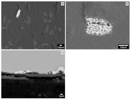 The alumina scale was well adherent to the substrate (Figure 4a and Figure 5a). Nevertheless, locally, a detachment of the scale on the Al71Co29 alloy was observed (Figure 8). A scale delamination was found preferentially around β-AlCo dendrites. The situation is shown in Figure 8c. An explanation of the layer spallation could reside in a mechanical stress developed during oxide growth. The stress is formed due to different molar volumes of the oxide and the underlying original metal substrate [76]. The stress generated in the oxide during excessive growth may lead to crack formation in the scale. The pores, cracks and other defects facilitate the access of molecular oxygen to the metal substrate.