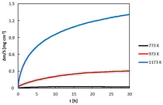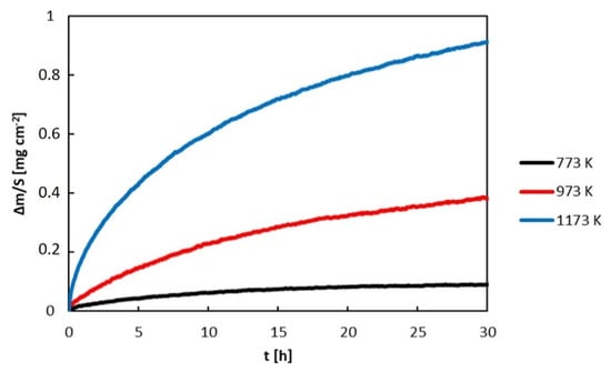 The oxidation behavior of the polished alloys was studied in flowing synthetic air (20 vol. % O2 and 80% vol. % N2). The air flow rate was 20 mL/min. Isothermal oxidation experiments were performed at 773, 973 and 1173 K. The polished samples were placed in an alumina crucible and heated from room temperature to peak temperature by heating rate 20 K/min. The oxidation time was 30 h. The mass gain of the samples was recorded continuously in a chamber of NETZCH STA 409 CD thermogravimeter (NETZSCH-Gerätebau GmbH, Selb, Germany). After oxidation, the samples were cooled down, mounted in epoxy resin, and cut perpendicularly to the reaction interface. The cross-sections of the specimens were prepared by wet grinding and polishing and subjected to microscopy observation.