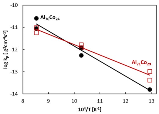 In this equation, A is a constant, EA is the activation energy, R is the molar gas constant (8.3144 J K−1 mol−1) and T is the absolute temperature (in K). The plot of rate constants at different temperatures is presented in Figure 11. The rate constants follow the Arrhenius-type behavior. Activation energy has been found from the slope of lines given in Figure 11. The activation energy of the Al71Co29 alloy is 90 kJ mol−1 and the activation energy of the Al76Co24 alloy is 129 kJ mol−1. These activation energies are comparable to activation energies for Al oxidation reported by previous studies [85,86].