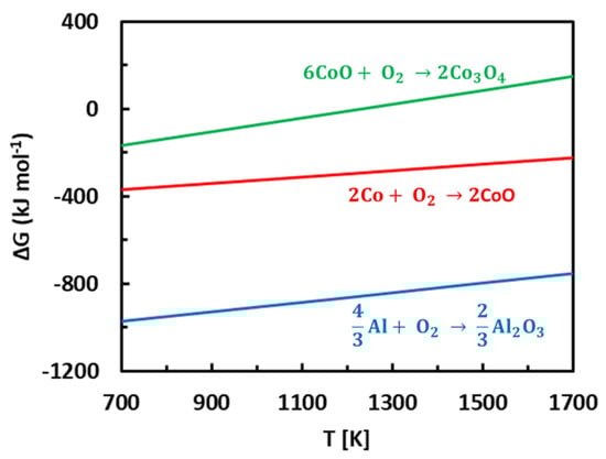 Nevertheless, ΔG reaction (4) is considerably larger compared to Gibbs free energy for aluminum oxidation (Figure 12). A further oxidation of CoO is even more energetically demanding [87,88]. Therefore, CoO tends to decompose in reaction with Al. The reaction can be expressed by the following equation