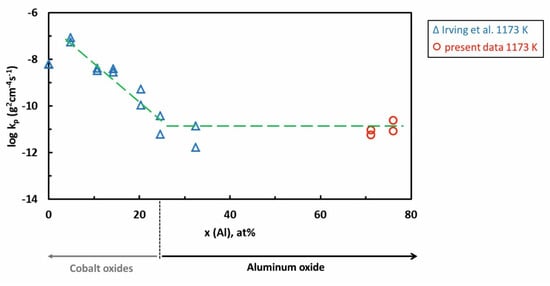 The oxidation of Co-rich Al-Co alloys was previously studied by Irving et al. [61]. The alloys were studied in the as-cast state. The authors studied several Co-xAl alloys with x = 0–32 at.%. Alloys with small Al concentration (< 10 at.%) formed a single CoO layer. Cobalt oxide layer grew with a considerably higher corrosion rate compared to Al2O3. At intermediate Al concentrations (10–20 at.%), the authors found that an inner layer of Al2O3 started to form below the outer CoO scale. With increasing aluminum concentration, a continuous Al2O3 scale has been developed. The comparison of the present results with those from literature is given in Figure 13. Our data complement the previous results of Irving et al. The continuous Al2O3 scale forms a barrier to cobalt diffusion. It hinders the nucleation and growth of cobalt oxides. Irving et al. found that a protective alumina scale can be formed when Al concentration 24 at.% at 1173 K is reached. Comparable minimum Al concentrations required to form the external alumina scale were also found for the Ni-Al and Fe-Al alloys [89].