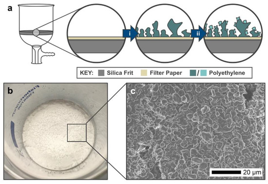 (a) A schematic showing the composition of the PE micropowder filters. The filter is constructed using a Buchner funnel/silica frit with a filter paper placed on top of the frit. The first layer (i) uses a heat treatment temperature of 140 °C, which forms a uniform base for the second layer (ii). The second layer uses a lower heat treatment (114 °C) which preserves the high surface roughness. (b) A digital photo of the filter made using S-µ sized PE powder. (c) An SEM image of the S-µ powder heated at 114 °C.