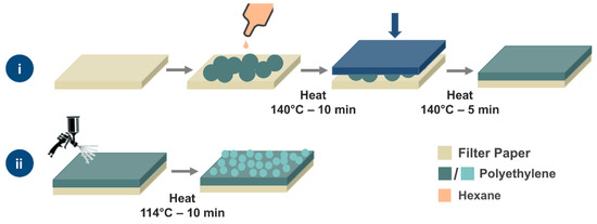 A schematic showing the fabrication method of the PE micropowder filters. For the primary layer (i), the PE micropowders are placed on a filter paper, dispersed by hexane and heat-treated (140 °C), followed by compacting and further heating. The second layer (ii) of PE is deposited by spray coating a suspension of particles in hexane and is annealed at 114 °C.