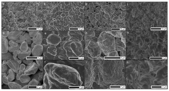 SEM images of S-µ PE powder under different heat treatments, where (a–c) shows a loose powder without heat treatment, and with heat treatment at 114 °C (d–f), 140 °C (g–i), and 160 °C (j–l).