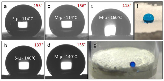 The ideal temperature of heat treatment was explored, using the reported PE bulk melting point (114 °C) as a foundation. Temperatures lower than this would not be sufficient for inter-particle binding, while when heated at 160 °C, a large portion of the powder would melt completely after 10 min. This high-temperature treatment led to a non-porous, marginally hydrophobic material when cooled to room temperature (Figure 4j–l). Holding the polymer at its melting point was found to be not enough to form a well-structured filter (i.e., poor structural integrity), despite the good superhydrophobicity observed (WCA above 150 °C). Therefore, a high temperature, typically 140 °C, was utilised to form a rigid material, which is still permeable so the hydrophobic solvent can pass through. The highest measured WCA at 140 °C (achieved with the S-µ particles) was found to be 142°.