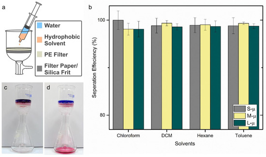 Separation efficiency experiments were carried out by depositing water/solvent mixtures onto the filter material (Figure 6a). Typically, 1.00 g (±0.01) of water was weighed and transferred by a syringe, then around 1 mL of hydrophobic solvent (chloroform, DCM, hexane, or toluene) was taken up into the same syringe. The entire syringe contents were emptied onto the filter all at once, with an approximate distance of 3 cm. After a few seconds, the water on the filter surface was collected via syringe and weighed. The separation efficiency percentage was calculated by dividing the mass of the water collected by the mass of the water poured onto the filter. A recording for the separation of chloroform/water mixture using an S-µ PE filter could be found in the supplementary information, and an image of a chloroform/water mixture separated using a S-µ PE filter is shown (Figure 6c,d). This larger-scale experiment enabled the estimate of flux (~23 mL s−1 m−2); however, this could be improved using an applied pressure, or variation in the filter design (e.g., thickness, particle diameter, etc.…).