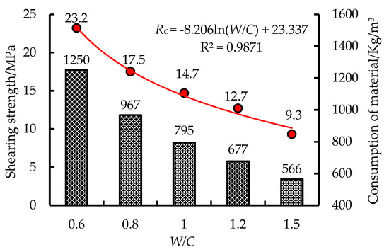 With the increase of W/C from 0.6 to 1.5, the shearing strength of the samples decreased from 2.97 MPa to 2.27 MPa.