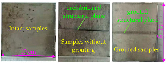 According to the above preparation method, there are three kinds of samples required for the experiment, i.e., intact samples, samples without grouting on the prefabricated structural plane, and grouted samples with the prefabricated structural plane. Three samples are shown in Figure 4.