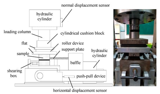The shearing unit system of the experimental system is shown in Figure 5, which is mainly composed of a hydraulic cylinder, the loading column, the push-pull device, the displacement sensor, the shearing box, and the support plate. The roller plate is added to the above samples to eliminate the influence of friction between the rock sample and the device during the shearing process.The shearing experiment scheme is shown in Table 2.
