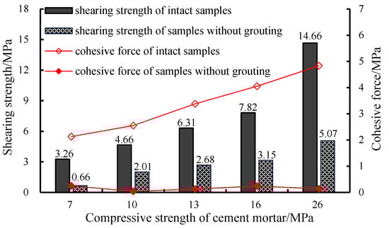 Comparing the shearing strength of the grouted samples can analyze the grouting effect. Analyzing the failure process of samples and the shape of shearing failure of the samples can provide the basis for analyzing the reasonable parameters of grouting for different strength rock masses [27,28,29,30]. Therefore, further analysis is carried out from the following two aspects.