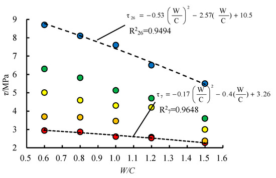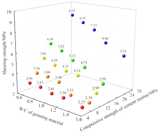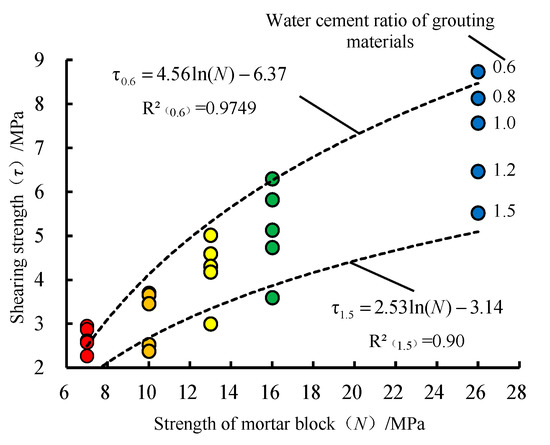 As shown in Figure 8, marks of the same color represent samples with the same N, from left to right are 7 MPa, 10 MPa, 13 MPa, 16 MPa, and 26 MPa; marks from top to bottom represent 5 kinds ofW/C (water-cement ratio) of grouting materials, i.e., 0.6, 0.8, 1.0, 1.2 and 1.5. The shearing strength characteristics of W/C from Figure 8 are as follows: