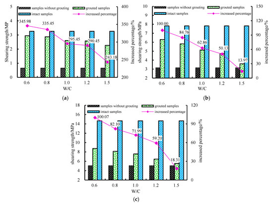 In Figure 10a, τ of samples increases significantly when the N is 7 MPa. The shearing strength of the grouted samples in five kinds of W/C increases significantly with an increase of about 243.18% to 343.18% by comparing the strength of samples without grouting, and the peak strength is close to the τ of the strength of intact samples.
