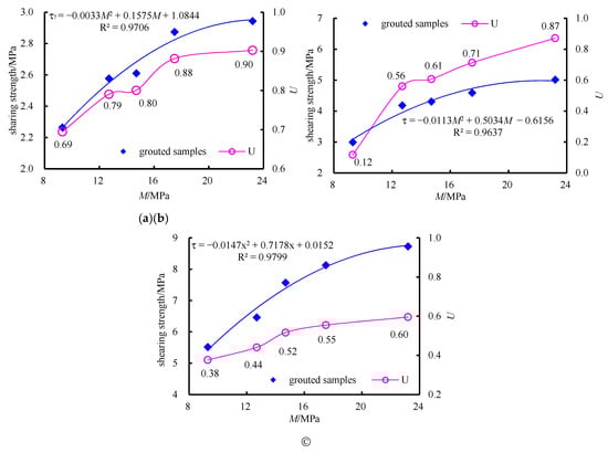 Figure 11 shows the fitting of the characteristic curve of M and τ, using the normalized value (U) to express the ratio of the shearing strength of the grouted samples to the shearing strength of the intact samples.