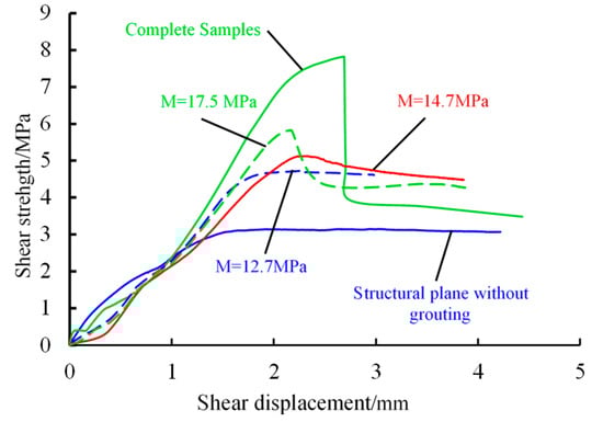 Figure 11 shows thatthe peak strength is not obvious in the sample without grouting on the prefabricated structural plane, and the sample grouted in which the M was 12.7 MPa. Although the shearing strength of the sample is improved after the grouting, the failure types are still the same, both of which are a plastic failure. When M increases to 14.7 MPa, the strength of the sample begins to show anunobvious peak value, which tends to alter from plastic failure to brittle failure. When M increased to 17.5 MPa, there was an obvious peak strength and showed brittle failure.