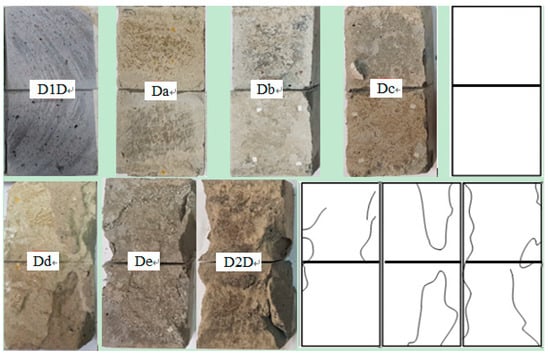 The failure process and the failure morphology characteristics of grouted samples can reflect the effect of grouting reinforcement, which provides a certain basis for selecting the reasonable parameters of grouting. Therefore, the morphology of failure and the shearing strength-displacement curve of samples with different M were analyzed. The samples in which the N was equal to 16 MPa were taken as examples to analyze, as shown in Figure 12.