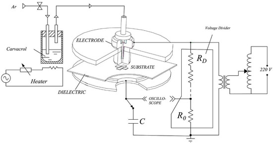 Film deposition was performed in an especially designed dielectric barrier discharge reactor depicted in Figure 1. It consists of two parallel circular brass electrodes, 3 mm apart from each other, fitted axially in two parallel Polytetrafluoroethylene PTFE discs. A polyester sheet on the grounded lower electrode served as a dielectric barrier, while sinusoidal AC pulses (60 Hz, 15 kV maximum amplitude) were applied to the upper electrode. Carvacrol (5-Isopropyl-2-methylphenol, (CH3)2CHC6H3(CH3)OH), at least 98% pure, was kept in a temperature controlled-stainless steel bottle. Argon, at a flow of 5 L/min, was used as a monomer carrier gas as well as to help in plasma ignition. A 1000× voltage divider and a Tektronix TDS1001C, Tektronix China Co. Ltd., Shanghai, China, (30 MHz, 500 MS/s) oscilloscope were used to measure the applied voltage vA and the voltage drop vc through a 10 nF-capacitor. Such values were recorded and used to calculate the plasma excitation power as follows: