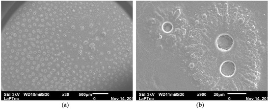 Figure 2 presents scanning electron micrographs of the coating deposited during 45 min, which is very similar to those obtained with samples grown under the other conditions investigated in this work (See Supplementary Materials Figures S1 and S2). As one can note, the substrate was covered by round structures uniformly distributed over the whole area. However, under higher magnification, as shown in Figure 2b, it is possible to observe that such structures are, in fact, holes surrounded by particle clusters of diverse sizes. To understand such a morphology, it is worthy to make clear that, under our experimental setup, the discharges used to deposit the coatings are filamentary [26] rather than homogeneously distributed over the whole substrate. Consequently, the holes are formed through the ablation of the coating by the intense and localized discharges. On the other hand, the clusters result from monomer polymerization driven by reactive species surrounding the filaments.